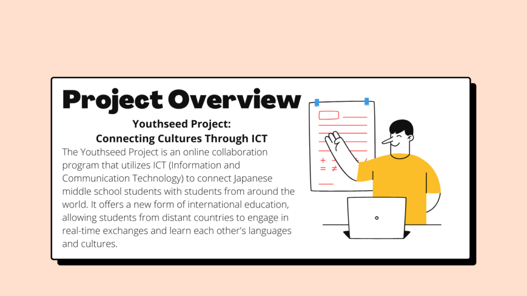 The Youthseed Project is an online collaboration program that utilizes ICT (Information and Communication Technology) to connect students from different countries. It provides a platform for Japanese middle school students and international students to learn about each other’s cultures and languages through platforms like Zoom and Teams.