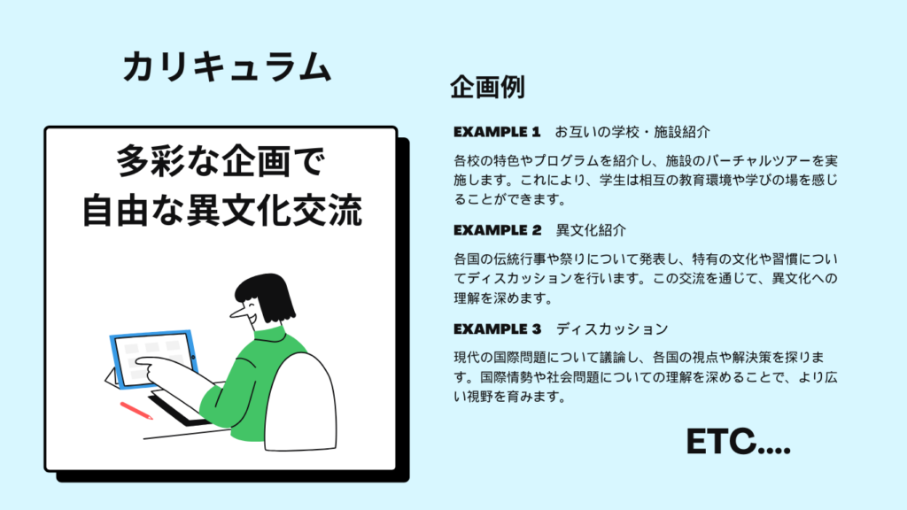 このプロジェクトでは、学生たちが実際にオンラインで顔を合わせ、言語の交換学習を行いながら、各国の学校生活や文化について紹介し合います。テクノロジーの力を活用し、地理的な距離を超えて、若者たちが直接交流できる機会を作り出しています。