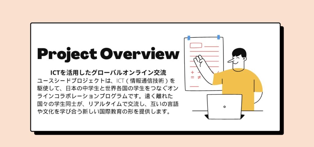 ユースシードプロジェクトは、ICT(情報通信技術)を活用した異国間のオンラインコラボレーションプログラムです。日本の中学生と海外の学生が、ZoomやTeamsといったプラットフォームを通じて、互いの文化や言語を学び合う場を提供しています。